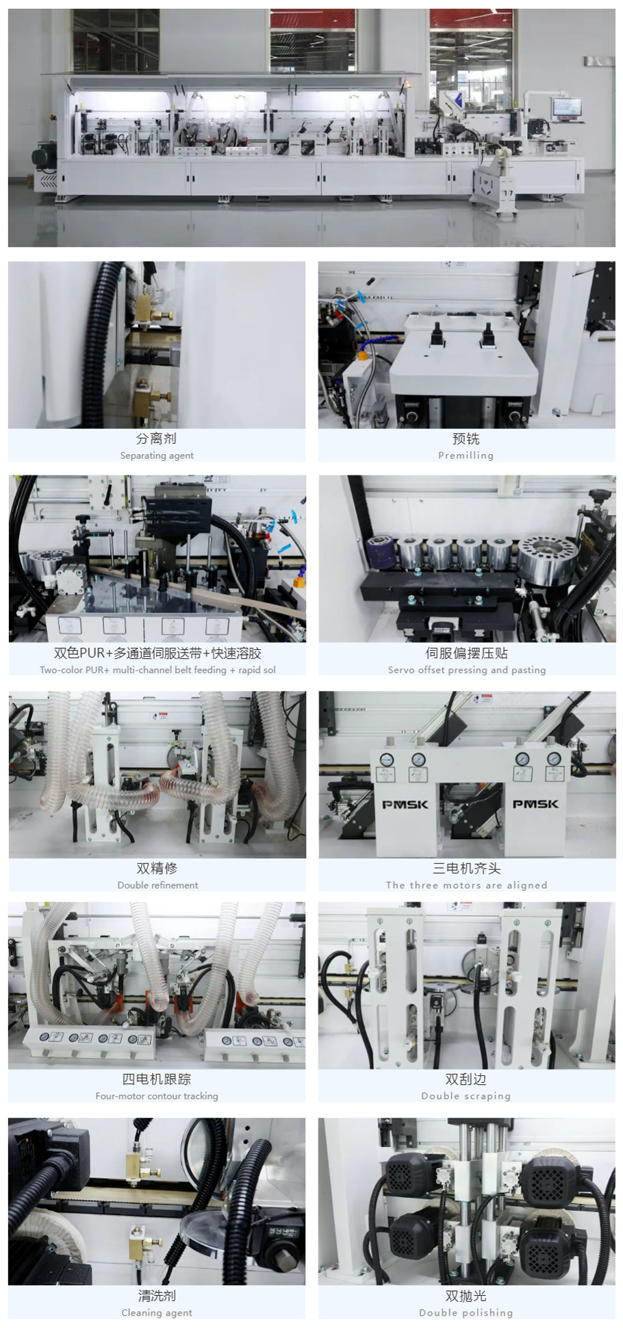 多通道伺服送帶,不同封邊條快速切換,伺服送帶減少封邊帶浪費,提升封邊穩(wěn)定性和效率。伺服涂膠,動作快速精準,涂膠連續(xù)性好,穩(wěn)定性高。